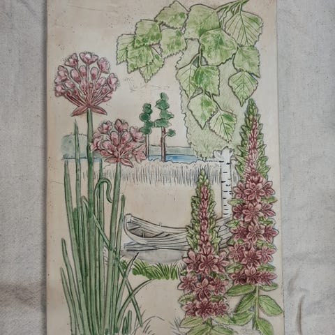 Svensk relief i keramik fra Jie med flot glans-glasur i grønne og hvide farver.