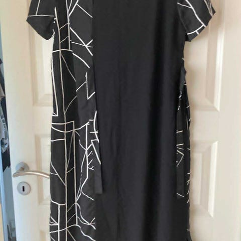 SORT KJOLE FRA, IN FRONT, MED RØDE BLOMSTER, OG SORT/ HVIDE KANTER PÅ HALS,LOMMER OG ÆRMER !! DEN ER LIGE OP OG NED ,SLANK MODEL , DER ER FOER I NEDERDEL!! MÅLER FRA ÆRMEGAB TIL ÆRMEGAB 52 CM ,TALJE 46 FRA SIDE TIL SIDE OG LÆNGERE NEDE 50 CM STR.M. FRA SKULDER OG NED 102 CM !!