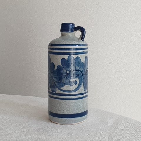 Vasen har en elegant, slank hals og smuk håndmalet dekoration i dybblå nuancer med geometrisk mønster. Et tidløst stykke dansk kunsthåndværk, der både fungerer som brugskunst og skulpturel dekoration i hjemmet.