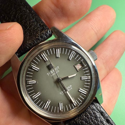 Other details: Tissot Seastar model # 642-40212, with seconds hand and date, crown and strap signed by Tissot, original sticker affixed at the back to protect the watch, original Tissot tag attached to the watch, beautiful dial with special line design, a special way to set the watch; pressing the crown to move the minutes hand.