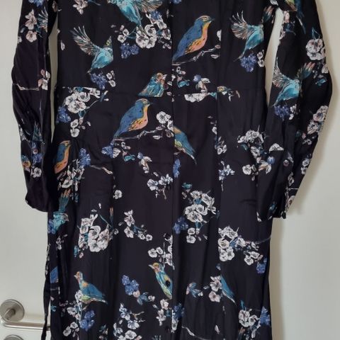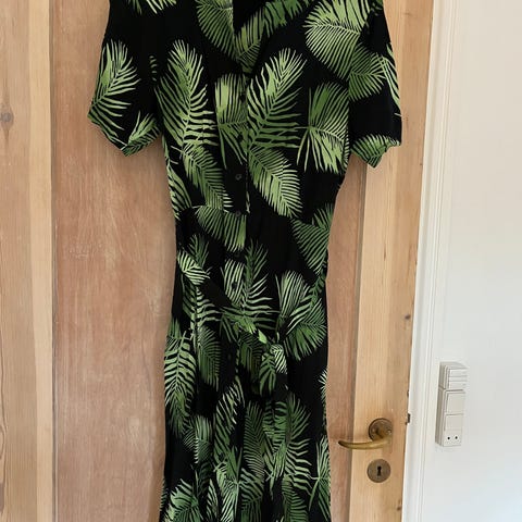 Kortærmet maxikjole med farvet print. Elastisk smock henover brystet. 100% viskose. Skjulte lommer i siderne. Helt ny og ubrugt og stadig med prismærke på.