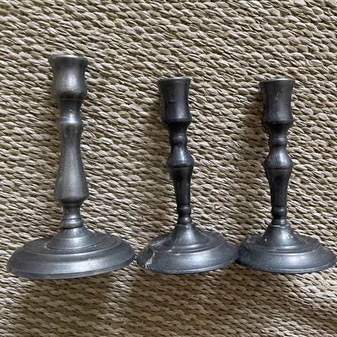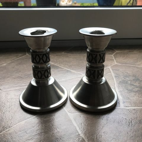 2 pæne tin stager til stearinlys. Ca. 40 cm høje.