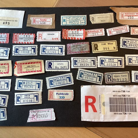 Er der mon stadig nogen, der samler på R-etiketter? Her er en lille samling fra dengang, Danmark stadig havde et velfungerende postvæsen. Nogle etiketter er lidt ældre, andre er nyere.