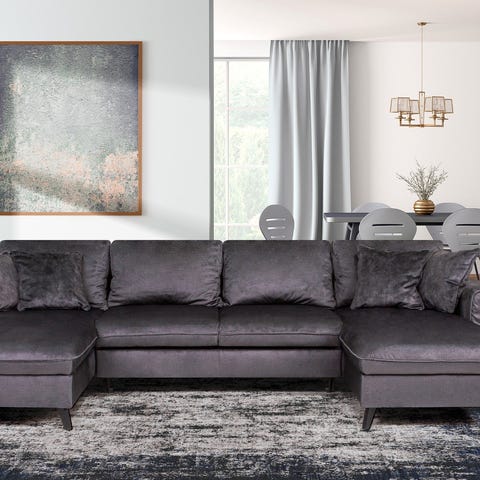 ▪ Mørkegrå hjørnesofa med el-styret sovefunktion, to opbevaringsrum, justerbare nakkestøtter og dekorative puder.