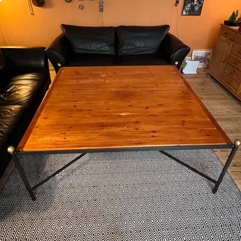 Massiv iroko plankebordplade til at lave et flot sofabord. Forberedt med metal afstiverer bagpå.