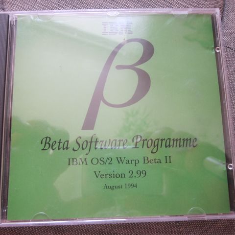 Her sælges en forseglet udgave af IBM's eget styresystem OS/2 Warp. Bemærk at der er en flænge i hylstret.