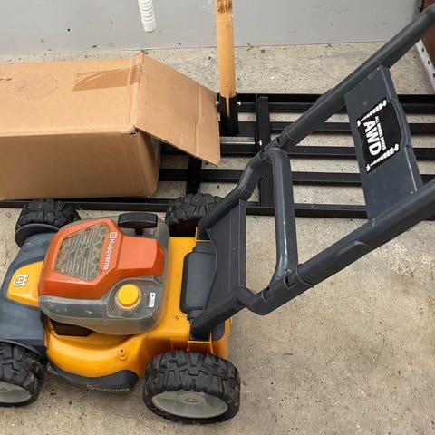 Fin og funktionel græsslåmaskine til børn. Er blevet bleget lidt i solen, men fungerer fint.