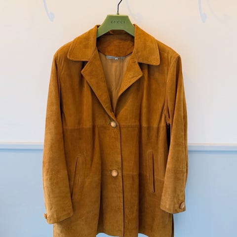 Vintage bomberjakke i ruskind købt i England i 70erne, str 16 (svarer ca til 34-36 eller xs/s). Mærke Verna Spence (made in England).
