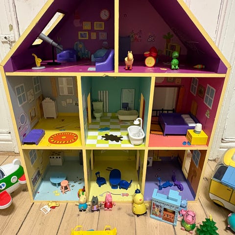 Stort Gurli Gris hus i træ med mange rum. 75 cm højt. Inkl. møbler - se billede. Har stået i sol og derfor er taget lidt afbleget på den ene side - se billede.