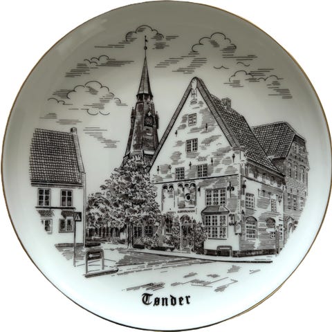 Platten er med blå stregtegning og med guldkant.