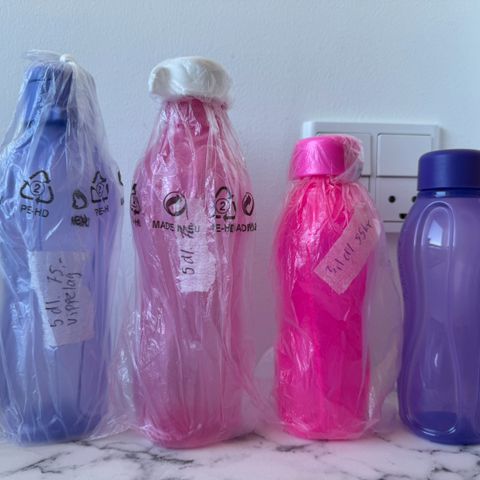 310ml drikkedunke fra Tupperware i lilla, blå og lyserød. De har brugsspor (den lyserøde ikke så meget) de fungerer som de skal.
