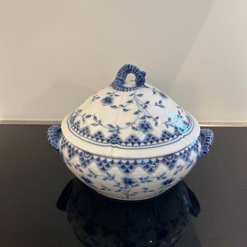 Tænker dette er årsagen til 2. Sortering. Den har ingen skår eller revner. Flot stand! Kan indeholde 3 liter. Det er udgaven uden guldkant. I kraftig porcelæn (så den kan holde maden varm) og den er håndmalet. Cirka mål er er 23 høj x 26 cm bred.