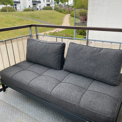 Jeg vil have lavet om på min terrasse, og derfor sælger jeg min super flotte og skønne daybed fra Blomus i mørkegrå. Den er 3 år gammel, og har altid stået inde om vinteren. Den er stadig virkelig fin, og synes stadig også farven er fin. Den har en lille prik af en art. Se billede. Der medfølger cover, som dog har et par huller. Den ses på tilbud lige nu til kr 5.089 + 343 for cover. Min pris er kr 1.950