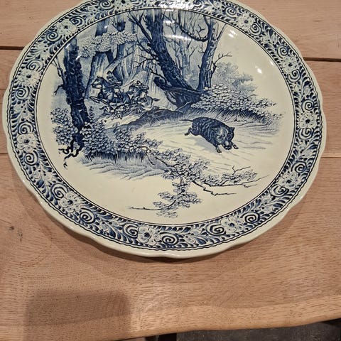 Porcelæn, Fad, Delfs (Boch), Stort cirkulært serveringsfad fra fe berømte producenter i Delfts. Fadet er 39 cm i diameter og har en højde på 5,5 cm. Det er i den kendte Delfts stil bemalet i blå dekoration, der er et landligt motiv. Det er i perfekt stand uden skader. Og meget velegnet til juleanden. Står på Mols men kan gratis leveres i Aarhus og Ebeltoft eller sendes billigt på købers regning