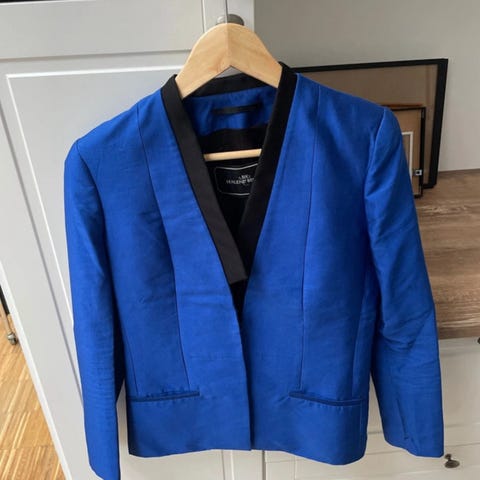 Blazer fra By Malene Birger i råhvid nuance i størrelse 42. Blazeren er fremstillet af 98% polyester og 2% elastan, medens for er fremstillet af 100% viskose. Brystmålet er cirka 110 cm og længden cirka 70 cm. BEMÆRK at der er skjult knaplukning se billede 3 og at der i foret i højre side er et stort firmasymbol se billede 5, hvorunder der er en mindre inderlomme
