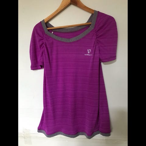 En træningstrøje grå med lilla detaljer, den har kun været brugt et par gange
