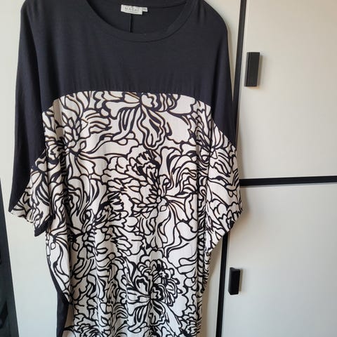 Fin og sommerlig kjole fra Masai. Den er som ny, da den har ligger nedpakket i årevis i håb om vægttab. Den har et Brystmål på 51x2 og en længde på 95 cm. Stoffer er 67% bomuld og 33 % polyester. Den har en krave med snøre så man kan puffe kraven op ( se foto 2) . Endvidere 2 store anvendelige lommer. Stoffer skal være som svagt krøllet for rustikt look.175kr eller byd.