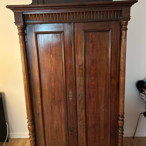 Yderst velholdt og rummeligt dækketøjsskab i mahogni. Købt for år tilbage hos en antik forhandler i Sønderjylland for 11.000kr. Det er med fine udskæring med en ridder på hver låge,flotte udskårne snoninger og udskårne frugter, der er ilagt intarsia på lågerne, og der er et originalt spejl over skabet..Vi er flyttet og det er for stort til vor nye mindre stue.Du er også velkommen til at byde på det. Byd hvis du er interesseret. Jeg vil gerne have mere plads i min stue.