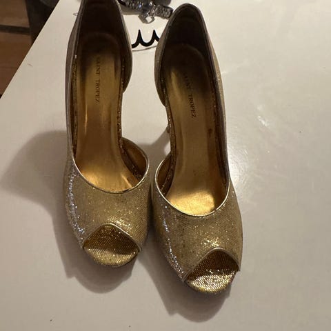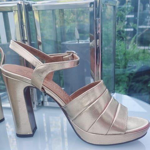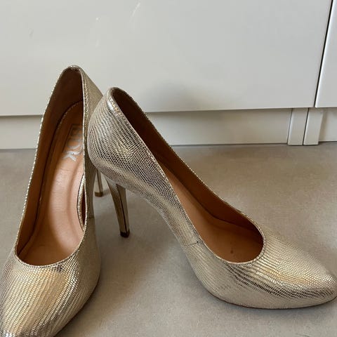 Rigtig fine guldsandaler med 6 cm hæl og fast hælkap. Smalle læderremme ved forfod med guld og sølv. Flotte til både lang og kort kjole.