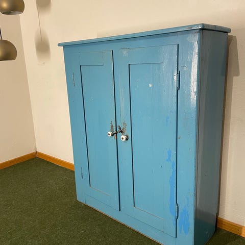 Blåt vintage skab i træ med 4 låger.