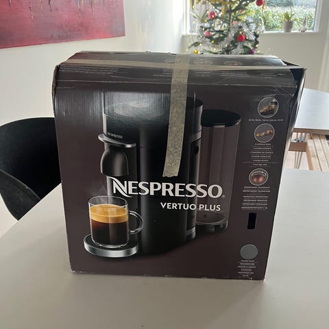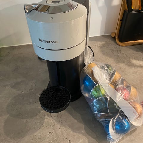 Nespresso Vertou kapsel kaffemaskine - meget lidt brugt og i fin stand. Benytter de nye store kapsler og der medfølger en pose med lidt forskellige.