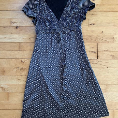 Fin MNG Basics kjole med et prikket mønster. Kjolen har en V-udskæring og knapper ned foran. Der er et bindebånd i taljen bagpå.