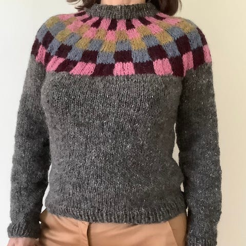 Sarah Lund i nyt Outdoor design fra FruStrik. Håndstrikket i tyk, blød islandsk uld - plötu lopi og med det karakteristiske stjernemønster. Sweateren er råhvid i bunden og stjernerne er lyse grå.