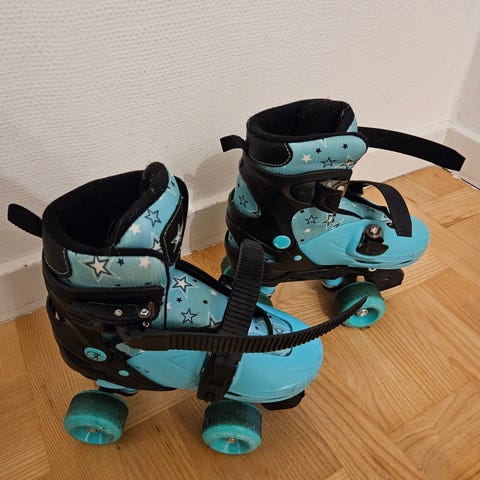 Børnerulleskøjter brugte og med synlig brugsmærker men gode som de første rulleskøjter til børn. Med knæ og albuebeskyttere samt håndledsbeskyttere.