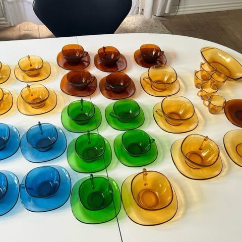 Smukke retro kopper i blå glas fra Vereco, France. Der er 5 stk's. De har ingen brugsspor og jeg gætter på, de er blevet samlet og aldrig brugt. 50 Kr pr stk. Køber betaler porto.