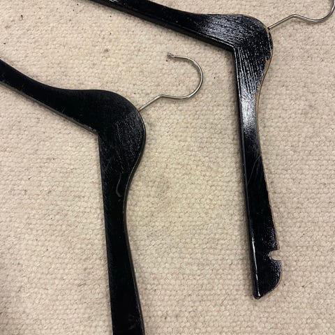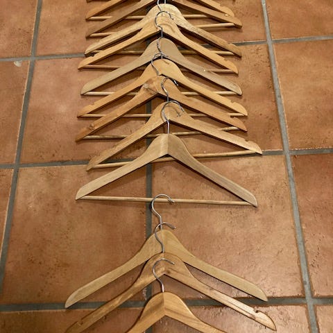 14 klassiske bøjler i træ. Forskellige farver, tre af dem er umalede. 50 kr. samlet