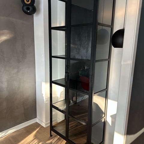 Nordal. Sort jern med glas-sider, låger og hylder.