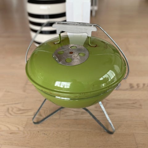 Weber mini kugle grill til kul. Super fin til altanen eller til at tage med på farten. Den er brugt sparsomt og mest bare stået opbevaret. Fejer intet.