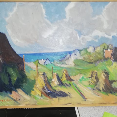 Akrylmaleri, Arnold William Pedersen, motiv: Landskab, stil: Naturalistisk, b: 64 h: 54, Akrylmaleri af Arnold William Pedersen ( 1912 - 1986 ) maler.
