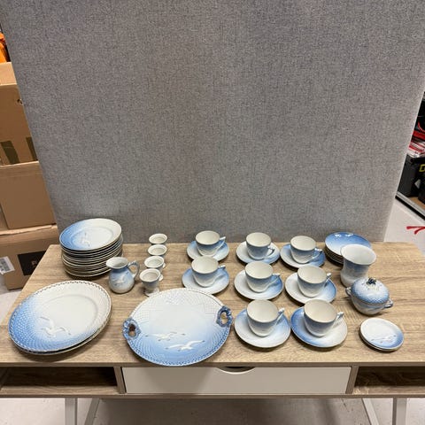 Vi sælger dette sæt bestående af kaffekopper, tallerkener, en kande og en skål, da de aldrig bliver brugt.