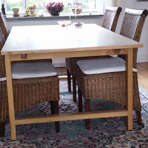 Egetræs bord med to tillægsplader. Med tillægsplader 3 meter langt.