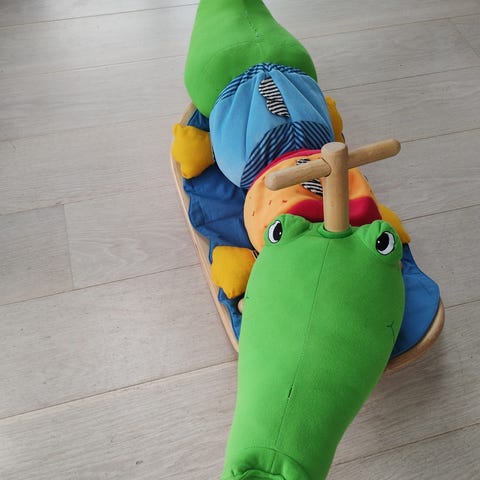 En“Gyngehest” der er en skildpadde som både kan gynge og man kan nemt tage mederne af og wupti så har man en gå”vogn”. Gedigen udførelse i træ.