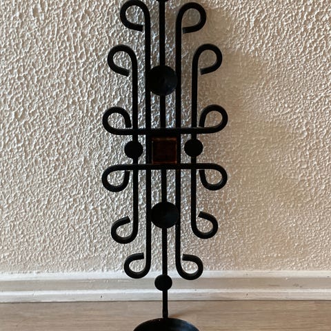 Væghængt lysestage i sort metal. Designet har en unik, geometrisk form med cirkulære elementer, væglysestagen passer til standard stearinlys. Desværre har den en lille skade, se billede.