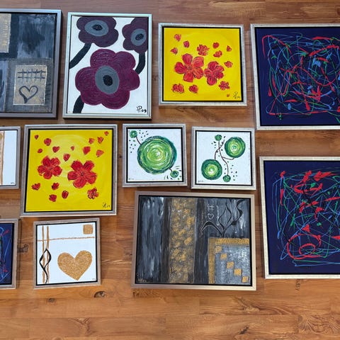 4 forskellige akryl malerier - et maleri 50 kr, 2 for 90 kr og alle 4 for 170 kr
