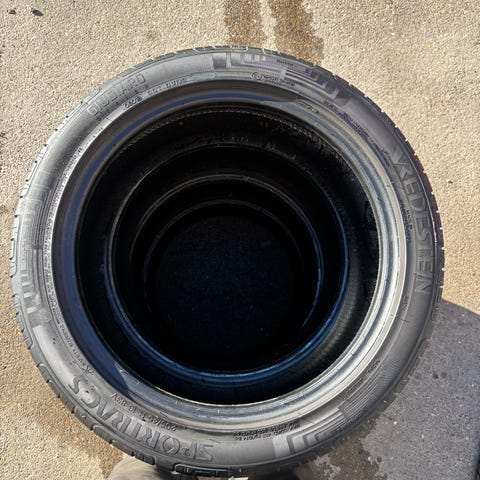 Dækkene er jævnt slidte, uden skader eller lapninger – stadig velegnede til et par sæsoner.