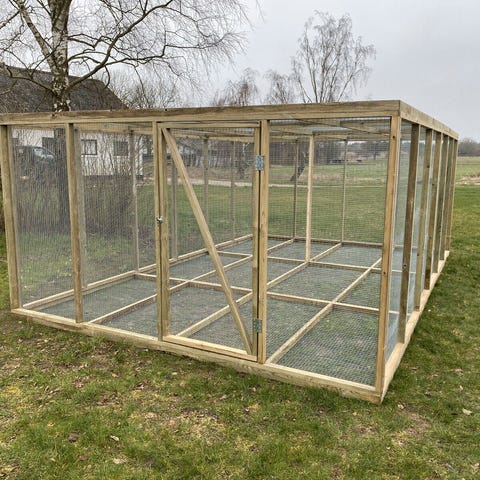 Udført i trykimprægneret træ monteret med galvaniseret volierenet.