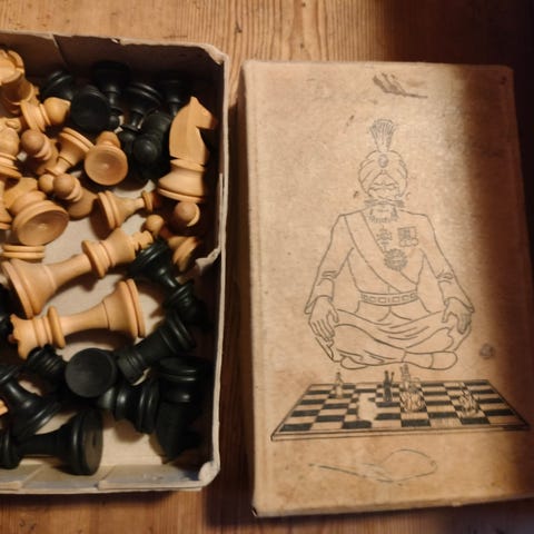 Gammelt skakspil mærket Rajah-Skak 83L. Pladen er mærket Rajah 50.