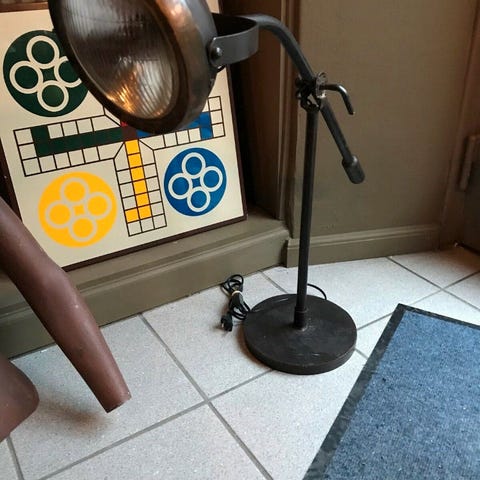 En lille sjov lampe, industriel. Lampen er udstyret med en stor pære, der er en del af designet. Højden er 50 cm.