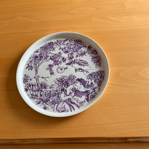 Fadet har nr 2359. Diameter på ca 26 cm. Det er 2. sortering antageligt pga af den lille prik. Se billedet. Farverne er kraftige harmoniske. Fantastisk flot fad.