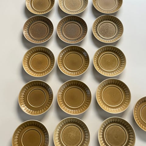 12 underkopper fra stellet Relief, designet af Jens Harald Quistgaard. Så fine som en lille kage- eller sidetallerken