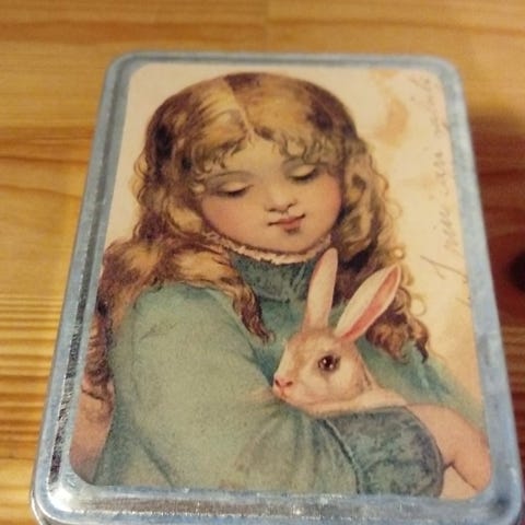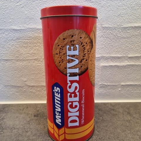 Denne dåse står i meget flot stand - blank gul farve, ingen tydelige rustpletter, og med skeen på siden, hvilket gør den mere komplet.