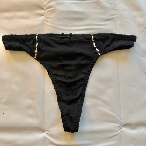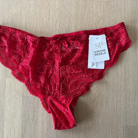 Blonde string fra Simone Perele i grøn farve med lilla musling. Størrelse S til kvinder. Fremstillet af blonder, der giver et elegant og delikat look. Perfekt til daglig brug eller særlige lejligheder. Helt nye, sender gerne køber betaler porto.