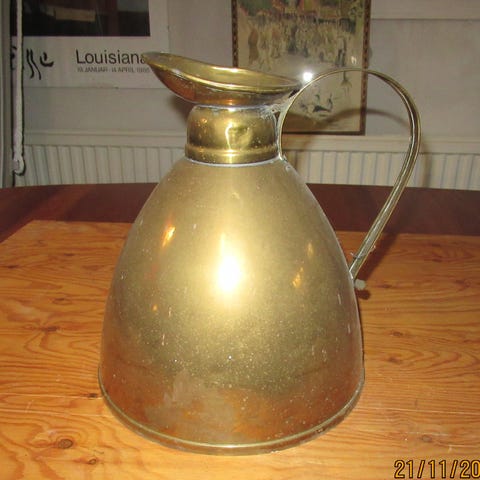 Flot antik messingkande med håndtag i træ og stativ i messing. Højde til top af låget 30 cm, og stativet har en diameter på 14 cm. Sendes ikke, men kan afhentes i Gilleleje eller Gentofte.