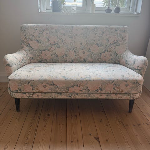 Fin lille sofa til 2. Stel i bøgetræ, nyt betræk i turkis/grøn. Meget velholdt. Ingen røg og husdyr. Mål 114 cm lang x 80 cm høj x 60 cm bred.Kan afhentes i København