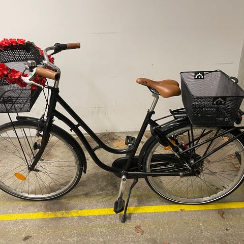 Kildemoes Citybike damecykel, stel 51 cm, hjul/dæk 28", 3 indv. gear, håndbremse for, fodbremse bag, dejlig stor indkøbskurv, lukket kædekasse, justerbar styr, lys for og bag.
