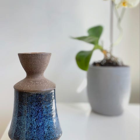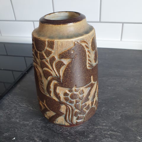 FIN LILLE MICHAEL ANDERSEN VASE I GRÅ OG BRUN ,MED SKØNNE BORNHOLMSKE MOTIVER ,